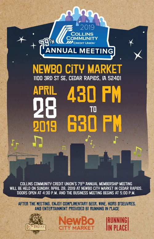 This is a flyer created for Collins Community Credit Union’s Annual Meeting that took place in the spring of 2019. The goal is to maintain the importance of information relation among our membership, while revitalizing the style of the event to attract members of all demographics.